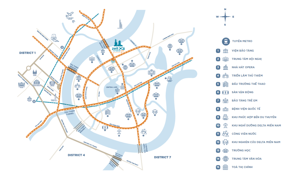 Tọa lạc tại vị trí đắc địa, nơi giao thoa giữa 2 tuyến đường huyết mạch: đường Nguyễn Cơ Thạch và đường Trần Bạch Đằng (Đại lộ Vòng cung), Thu Thiem Zeit River là tâm điểm phồn hoa với khả năng kết nối thông suốt đến khu vực trung tâm và lân cận.